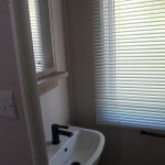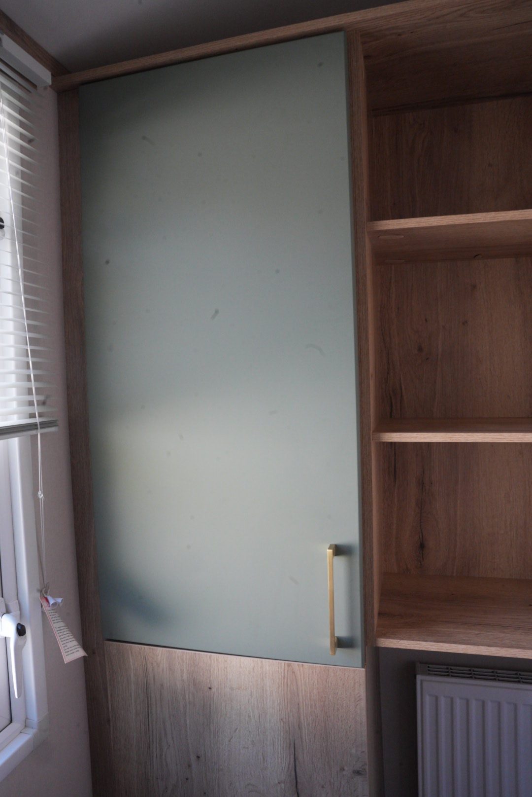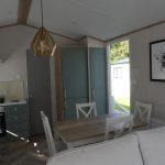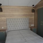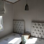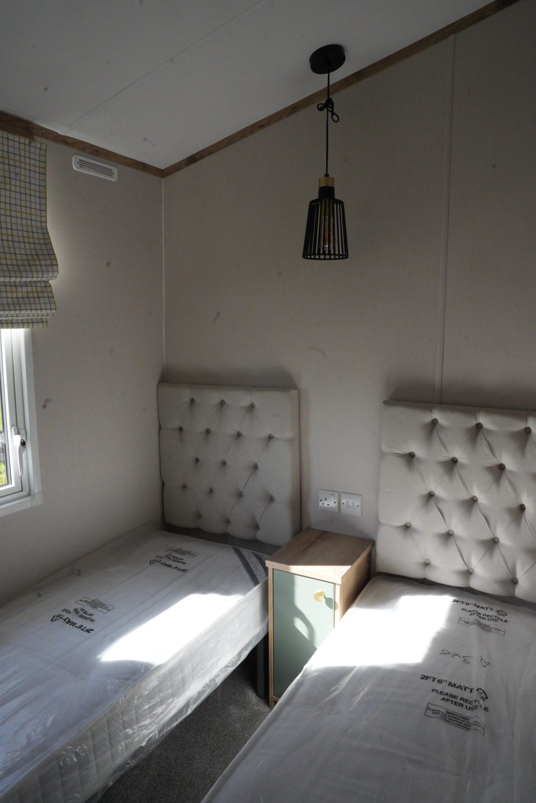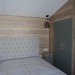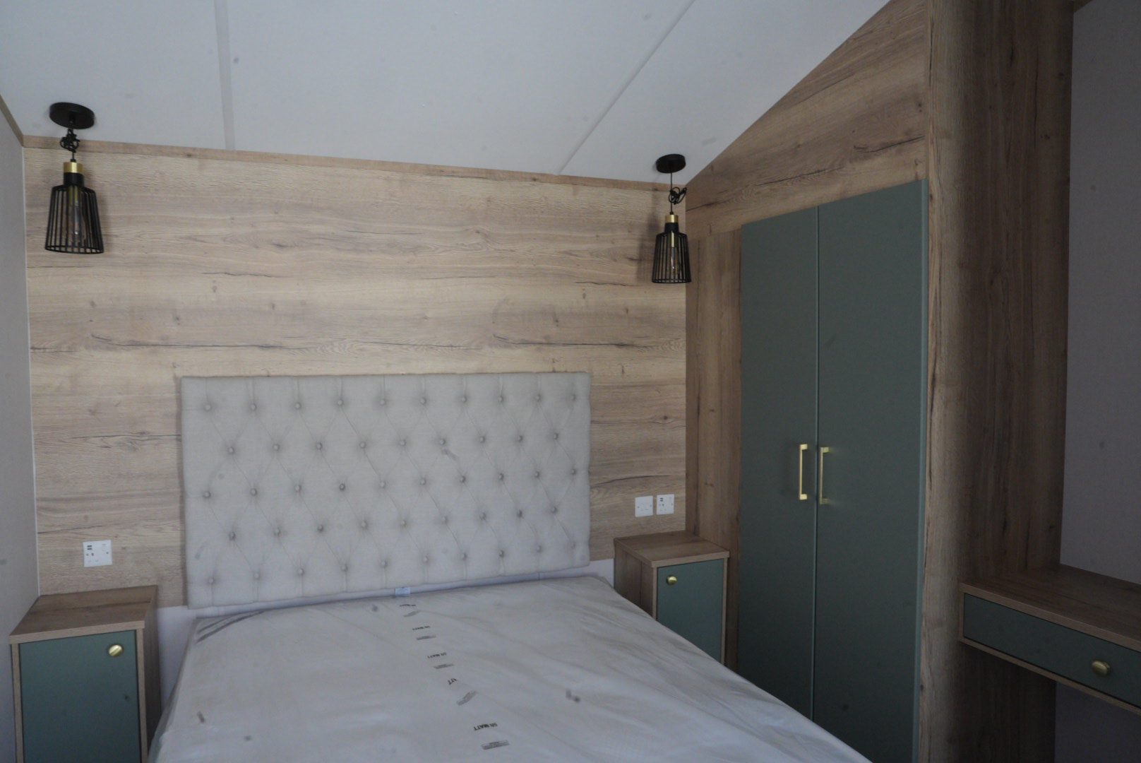 The lovely design and colour theme continues into the bedrooms. The master bedroom has a double bed with fabric button headboard and gives a cosy homely vibe. The bedside tables and fitted wardrobe are designed in a lovely wood effect and have willow green painted doors that coordinate with the colour scheme throughout. The fixed dressing table has a contemporary oval mirror and tub style stool, a charming area to sit and get ready.