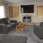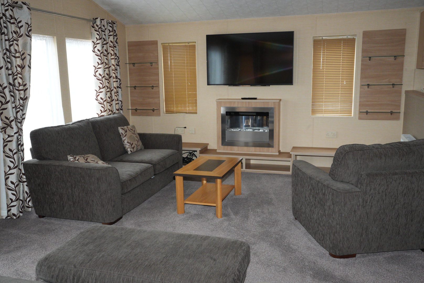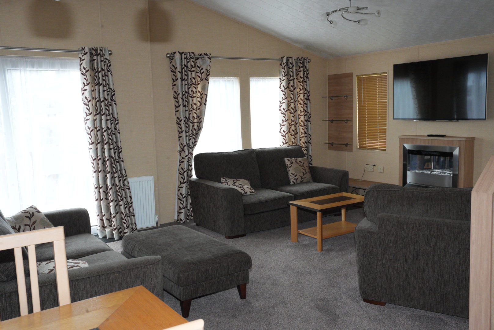 Lounge The good sized lounge is flooded with light from the large windows plus the patio doors leading off th e lounge to the decked area. The focal point of the lounge is the modern feature fireplace with flame effect fire with comfortable lounge seating arranged around with wall mounted TV