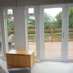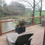 The heart of the home is a bright, open-plan living and kitchen area, complete with built-in appliances and plenty of room for entertaining. French doors open out onto a wrap-around decking area with sleek glass balustrades, offering stunning views across the surrounding countryside and the peaceful fishing lake just steps away.