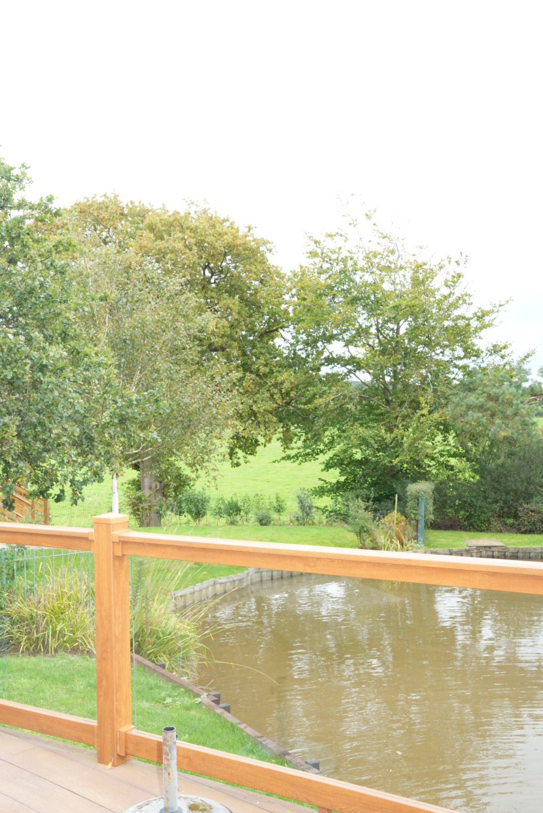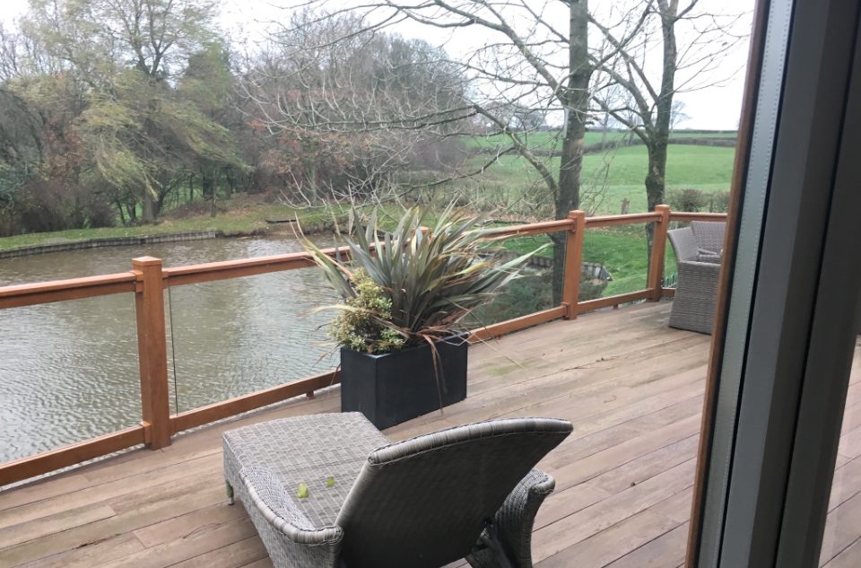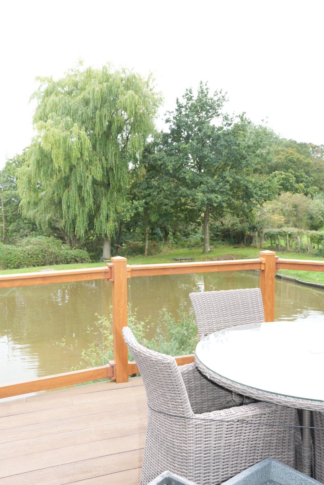 The heart of the home is a bright, open-plan living and kitchen area, complete with built-in appliances and plenty of room for entertaining. French doors open out onto a wrap-around decking area with sleek glass balustrades, offering stunning views across the surrounding countryside and the peaceful fishing lake just steps away.